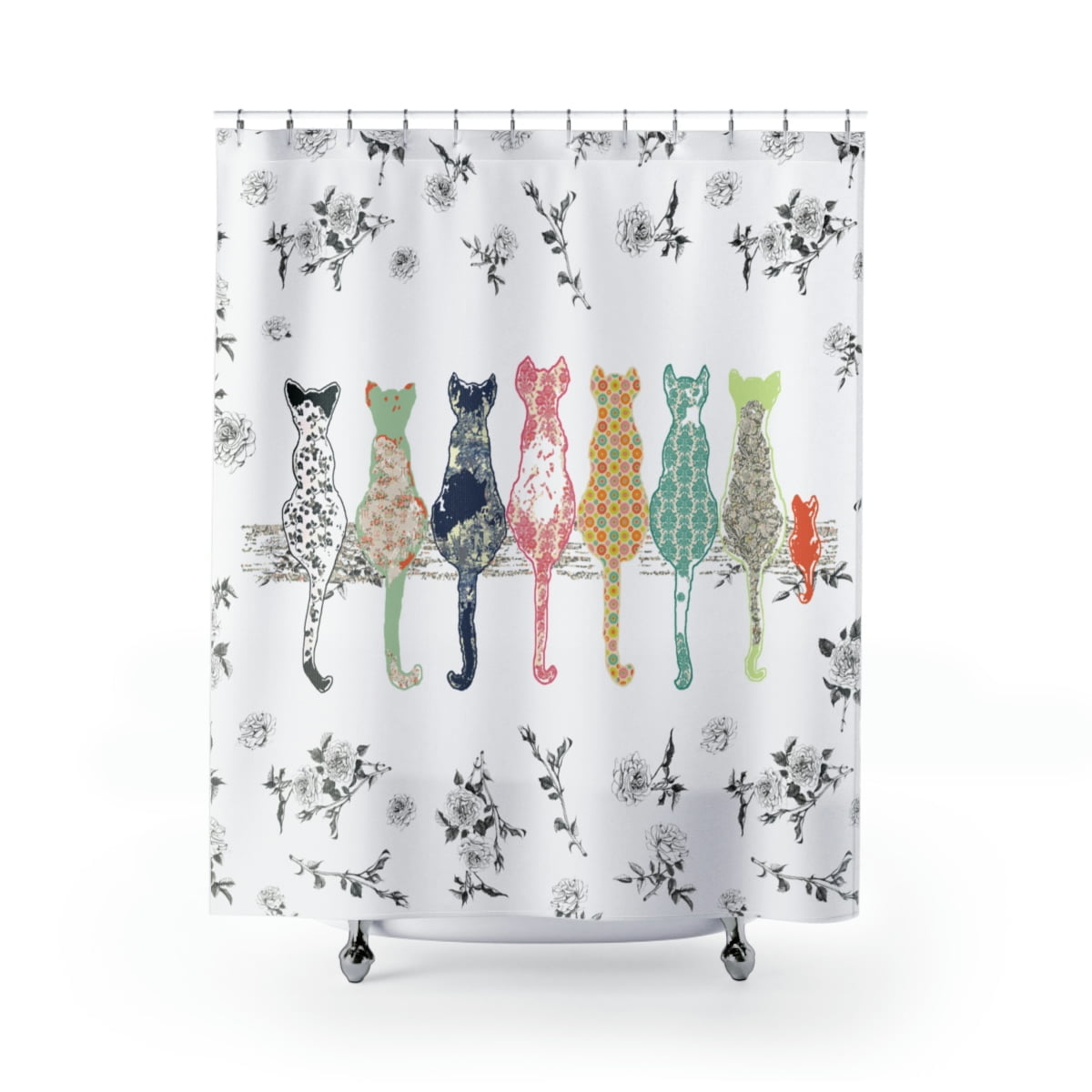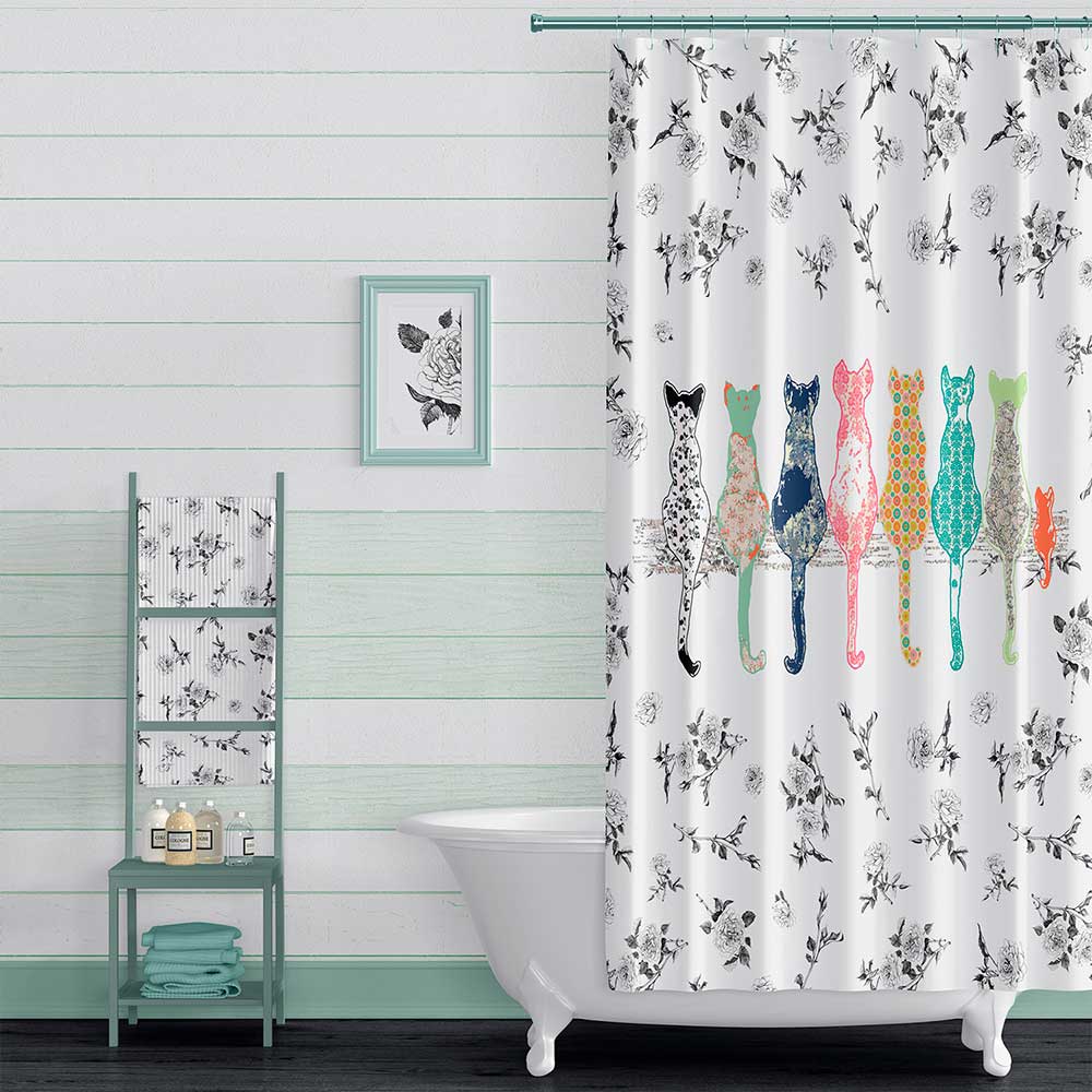 PREMIUM Fabric Shower Curtain in Black & White – Mold & Mildew Resistant – Waterproof – 71×74 inches – Artist Designed Cute Cats & Floral Rose Design
