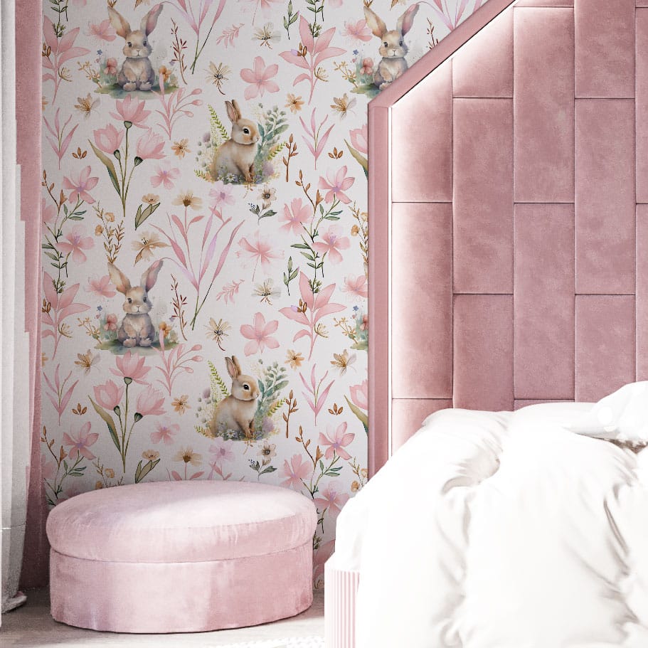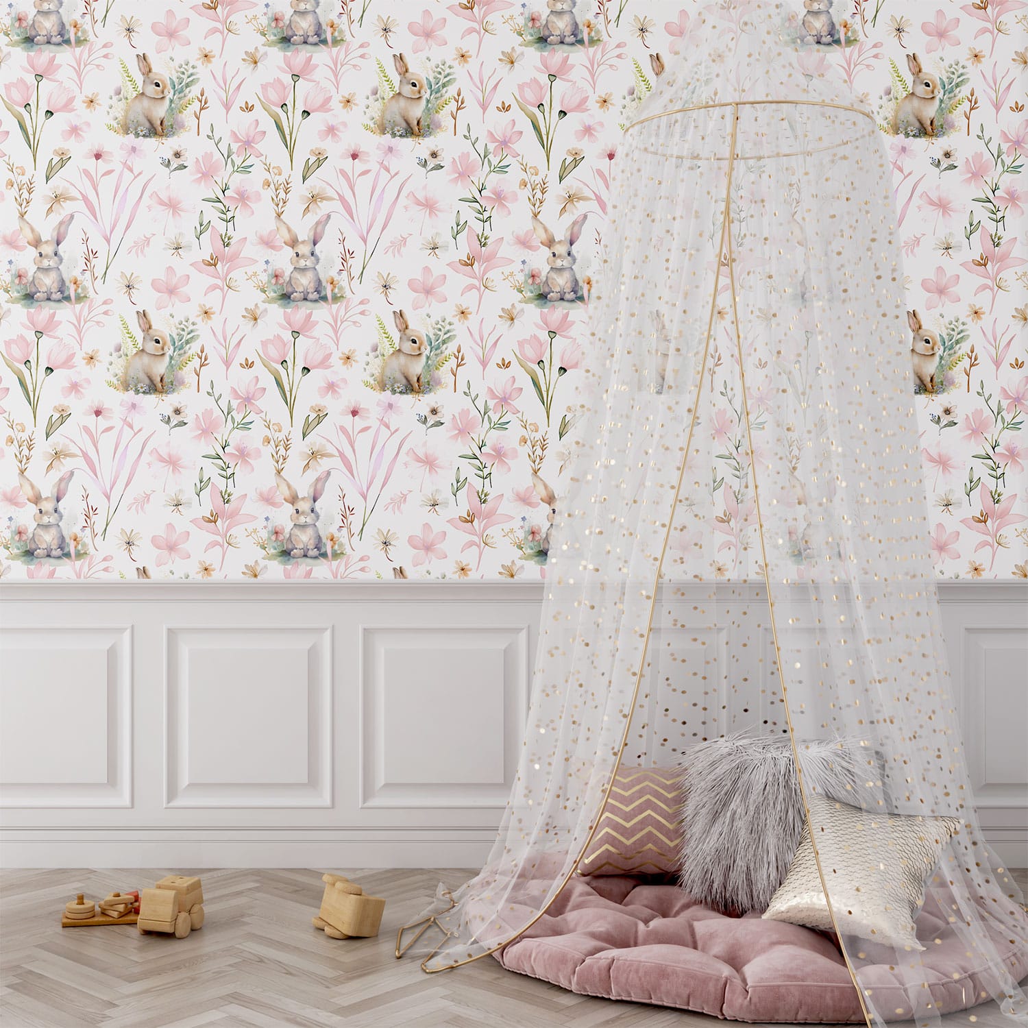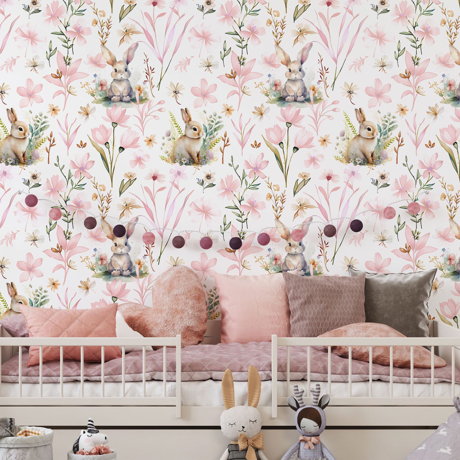 Blue Floral Bunny Rabbit Wallpaper For Kids