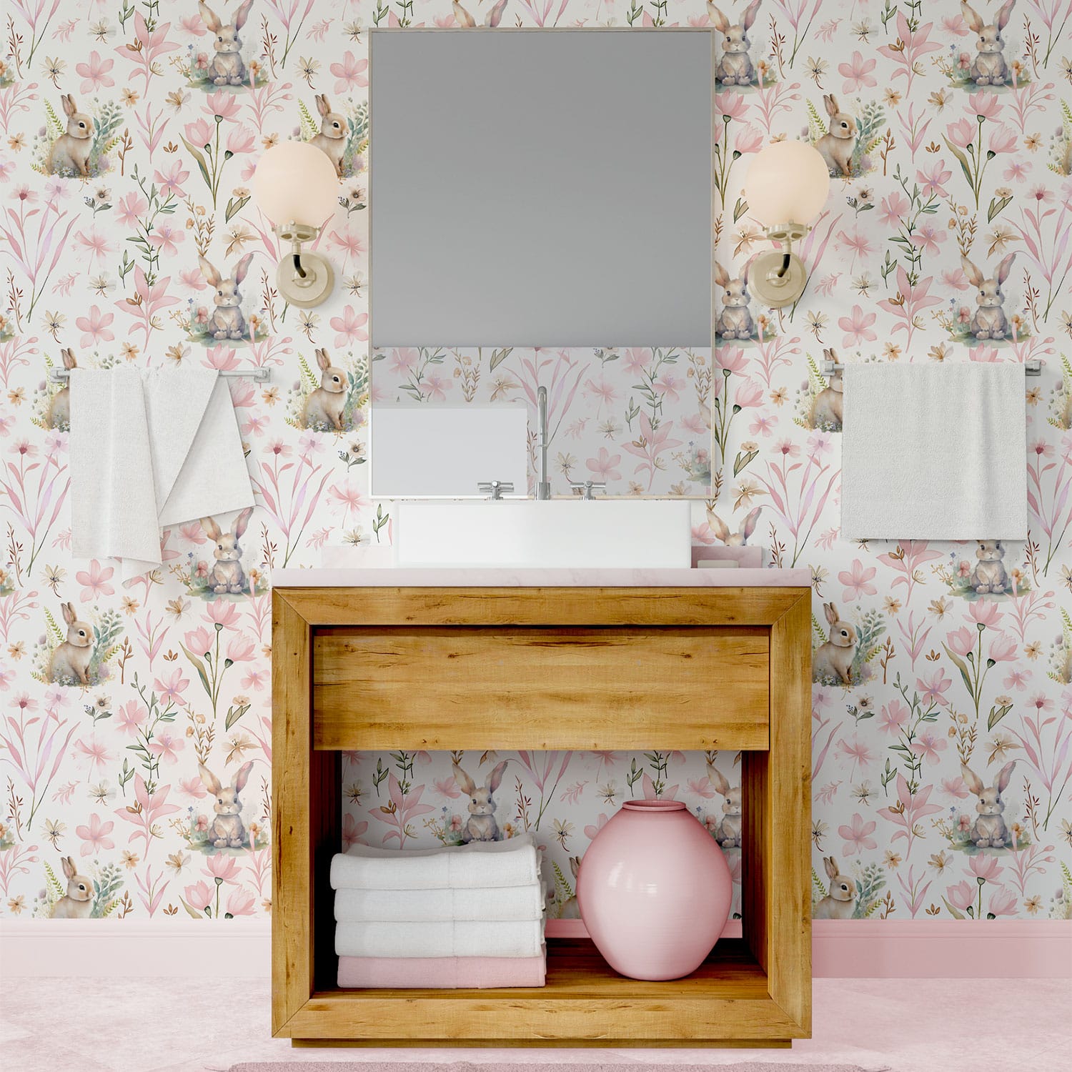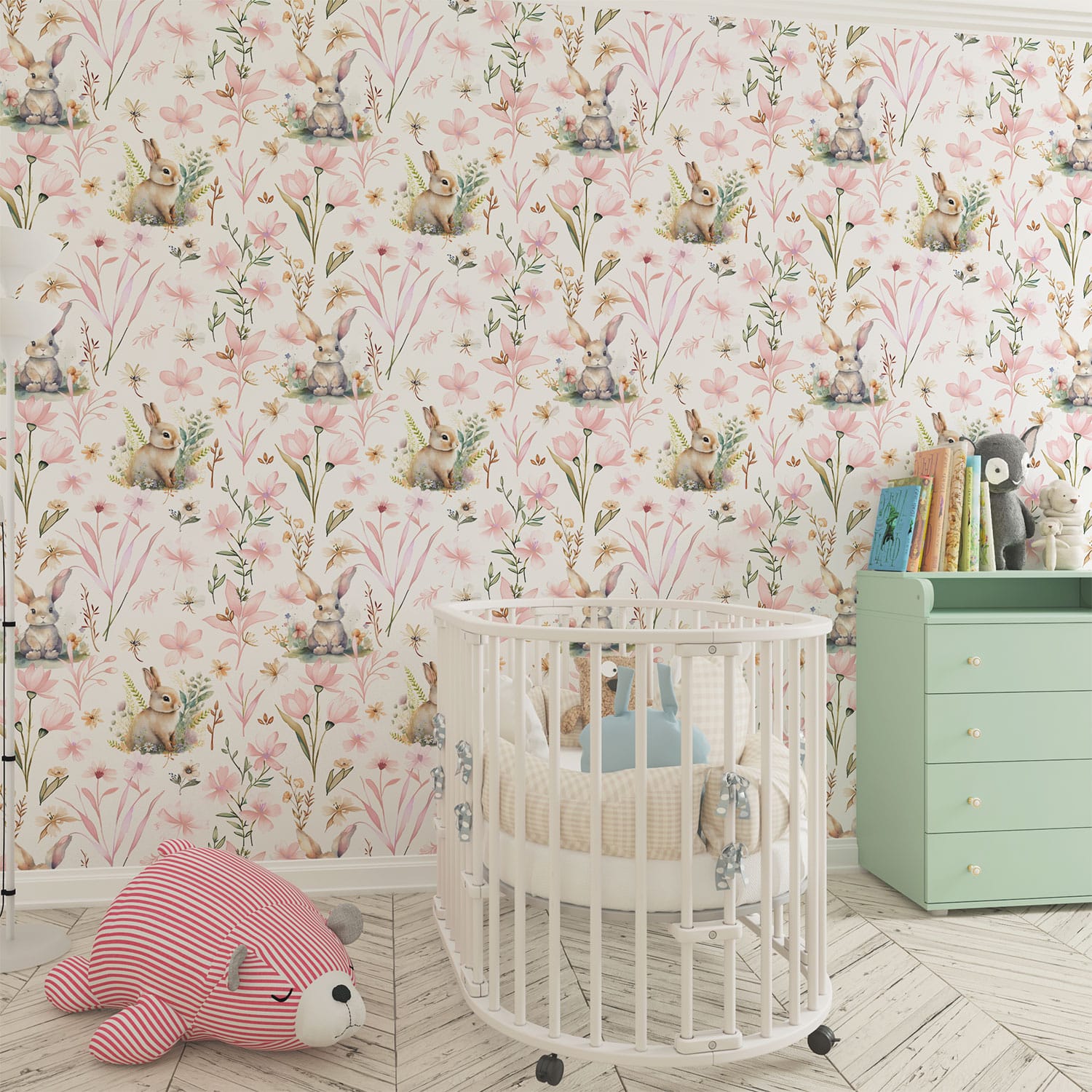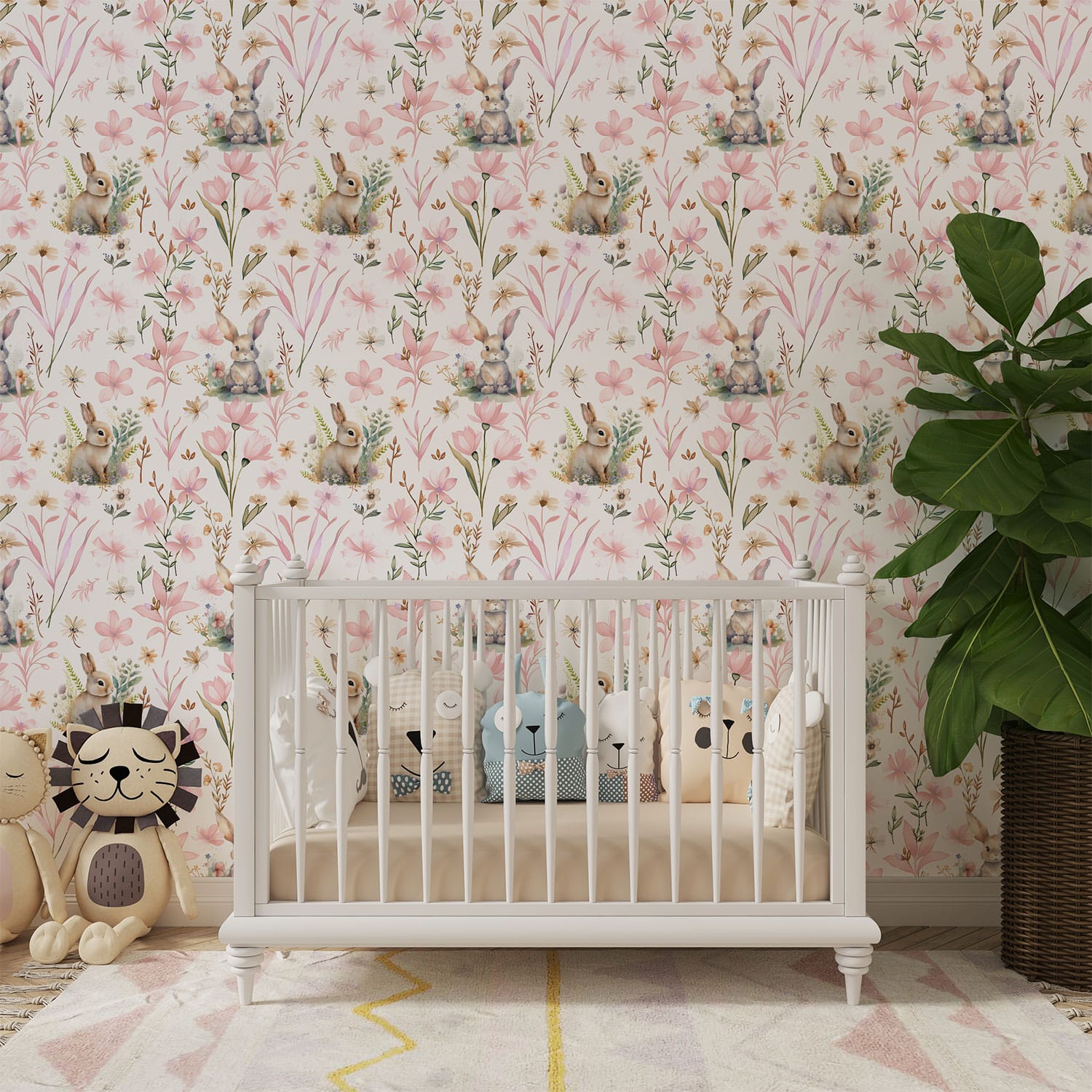 Blue Floral Bunny Rabbit Wallpaper For Kids